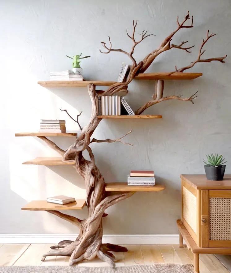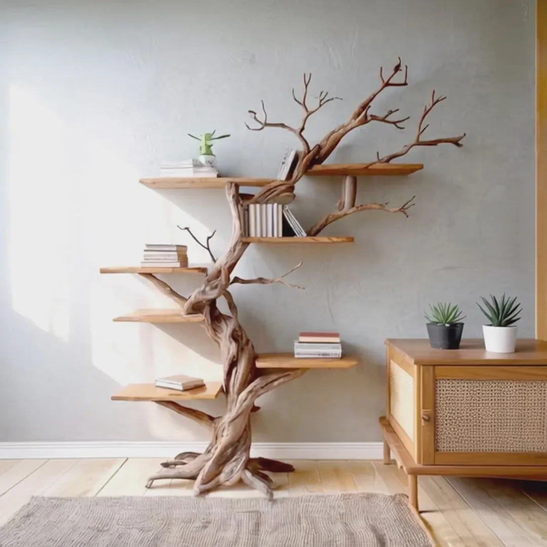 The clear protective finish protects the surface and highlights the tone of the wood. Branch spacing supports both standard novels and taller art books. Shelves can also hold planters frames and small speakers. Distribute weight across branches rather than loading a single shelf when placing heavy items.
