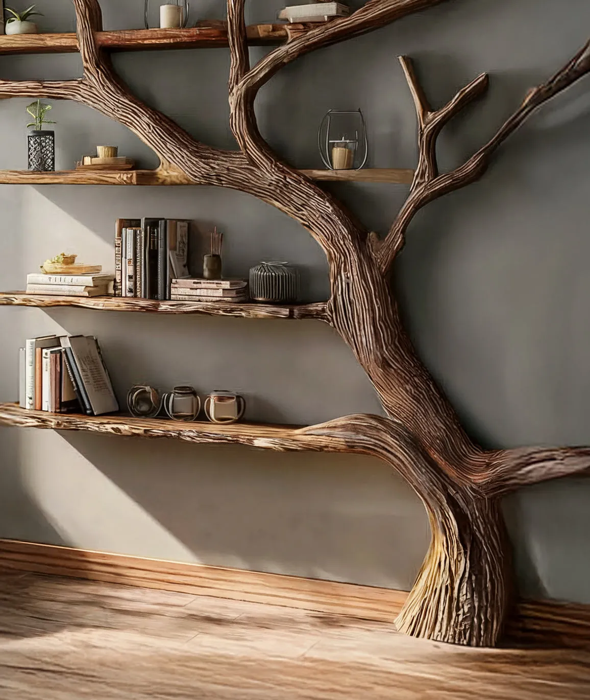 Driftwood Wall Bookshelf Rustic Farmhouse Floating Tree Branch Design brings a calm natural accent to everyday storage. It is a handmade branch layout bookcase built from real driftwood. The layout follows the grain and gentle branch lines so the form feels organic not forced. The look suits farmhouse rooms and blends well with simple modern spaces.