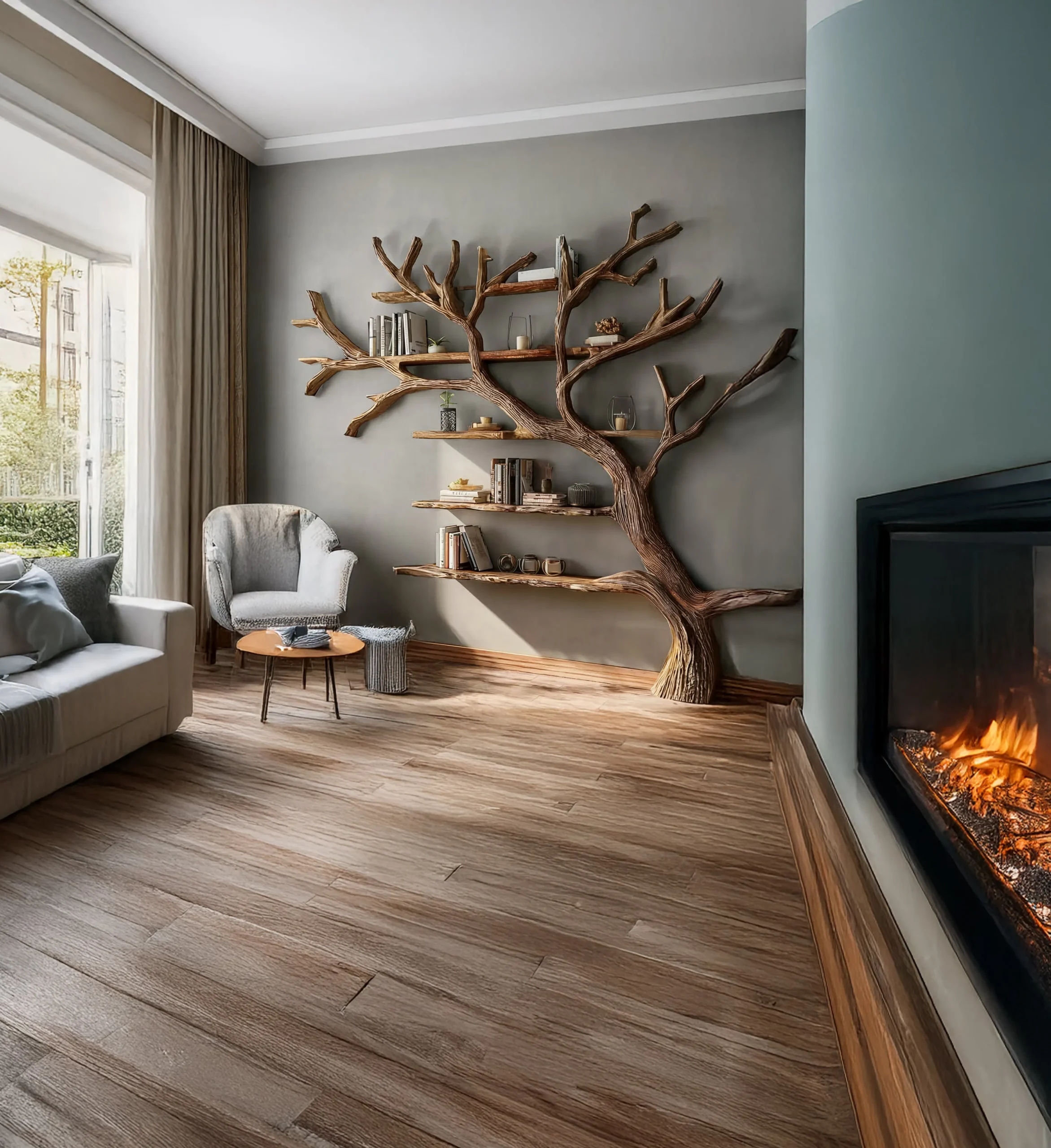 Typical uses include paperbacks candles and framed prints. Place the unit where daylight can wash across the face to show the grain. In narrow rooms a vertical format keeps walkways open while still holding a week of reading within reach. If you plan a gallery wall let the spine sit center and allow branches to guide artwork layout.