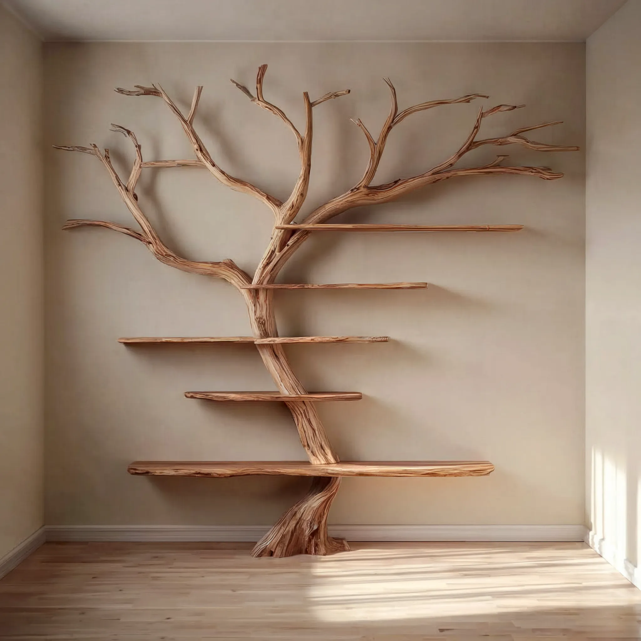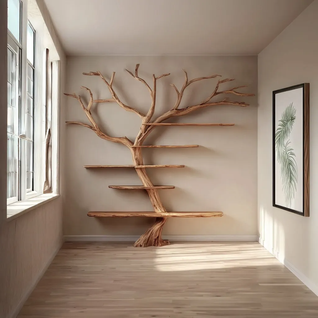 The low sheen varnish finish protects the surface and highlights the tone of the wood. Branch spacing supports both standard novels and taller art books. Shelves can also hold planters frames and small speakers. Distribute weight across branches rather than loading a single shelf when placing heavy items.