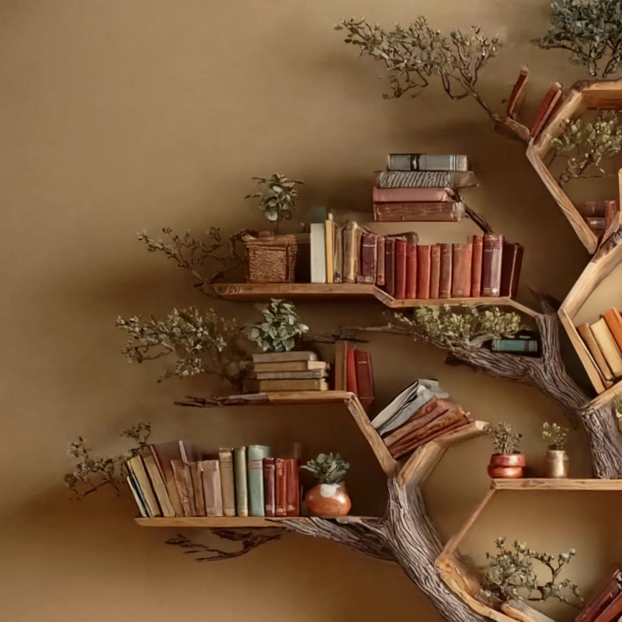 The matte seal finish protects the surface and highlights the tone of the wood. Branch spacing supports both standard novels and taller art books. Shelves can also hold planters frames and small speakers. Distribute weight across branches rather than loading a single shelf when placing heavy items.