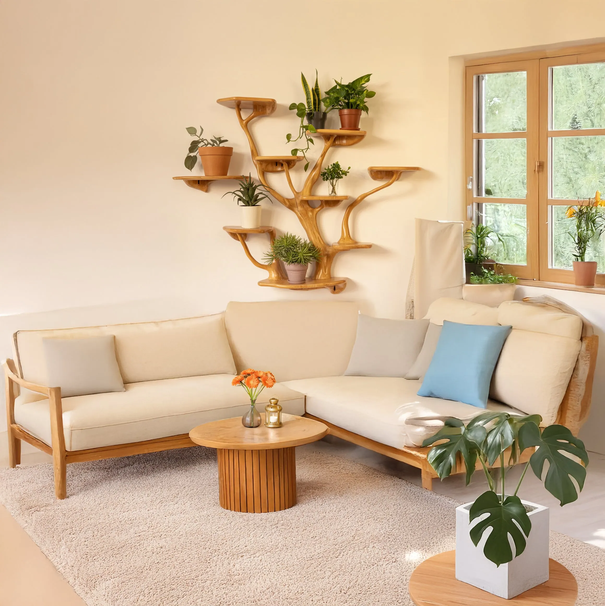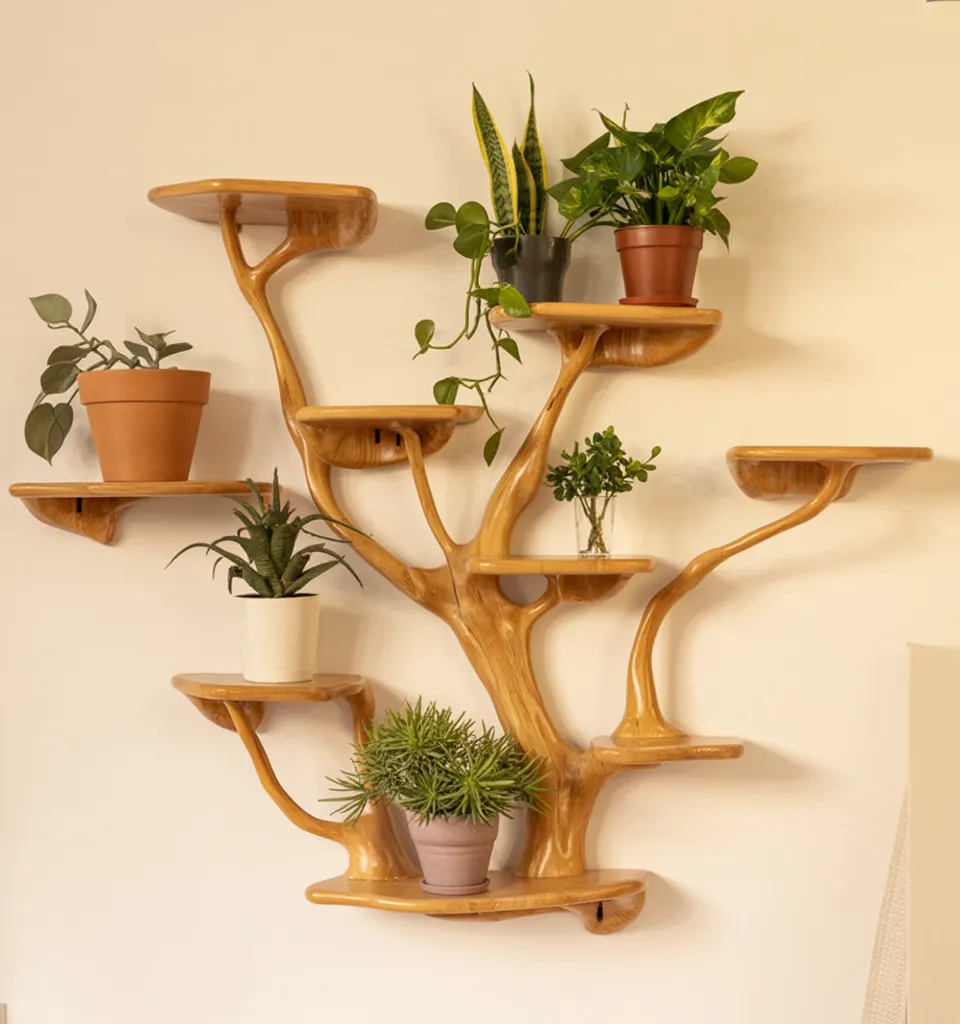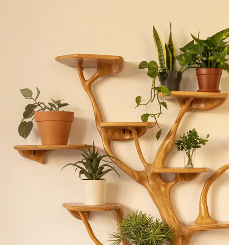 The driftwood look finish protects the surface and highlights the tone of the wood. Branch spacing supports both standard novels and taller art books. Shelves can also hold planters frames and small speakers. Distribute weight across branches rather than loading a single shelf when placing heavy items.