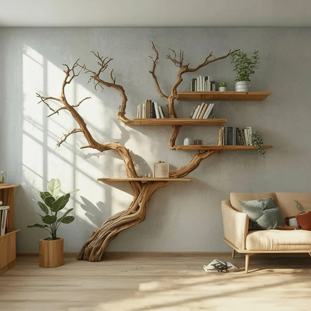 The clear wax finish protects the surface and highlights the tone of the wood. Branch spacing supports both standard novels and taller art books. Shelves can also hold planters frames and small speakers. Distribute weight across branches rather than loading a single shelf when placing heavy items.