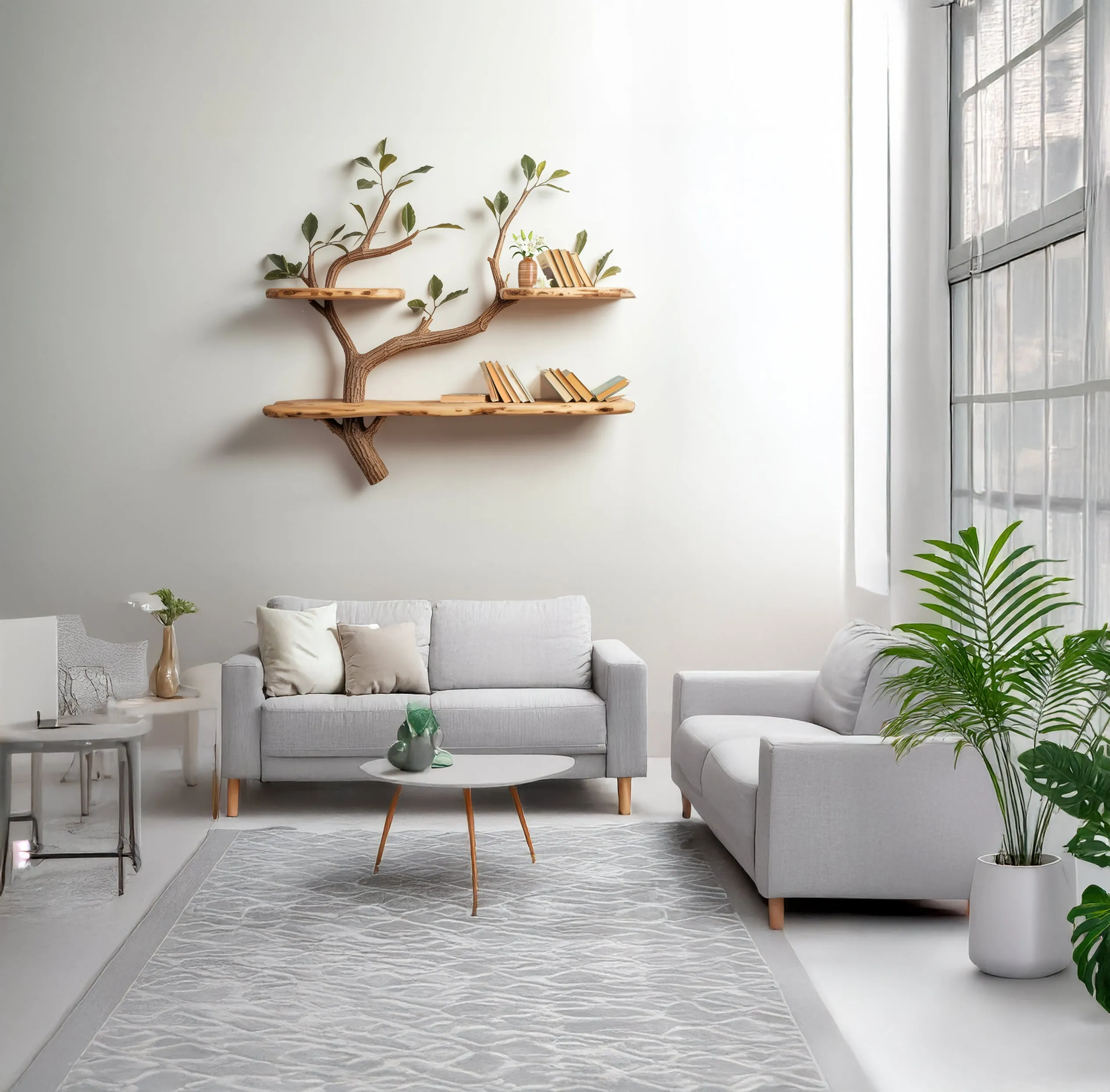 The hand rubbed oil finish protects the surface and highlights the tone of the wood. Branch spacing supports both standard novels and taller art books. Shelves can also hold planters frames and small speakers. Distribute weight across branches rather than loading a single shelf when placing heavy items.